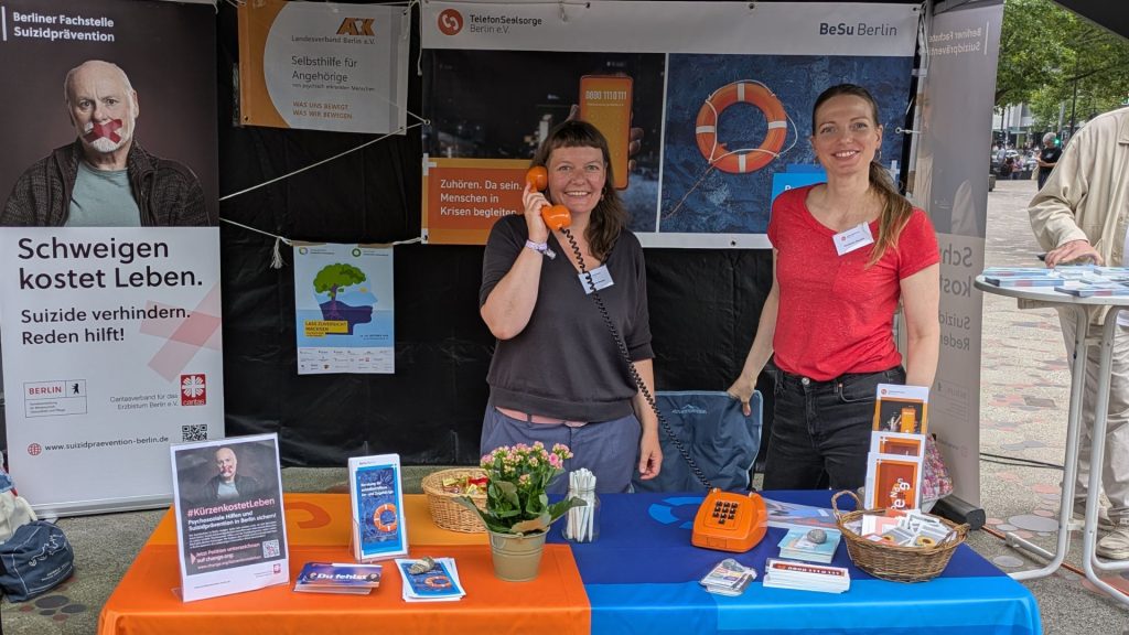 - Welttag der Suizidprävention 2025Am 10. September waren wir beim Programm des Netzwerks Suizidprävention Berlin rund um die Gedächtniskirche dabei – am Info-Stand und in der Diskussionsrunde „Suizidalität im nahen Umfeld“.